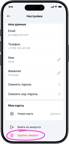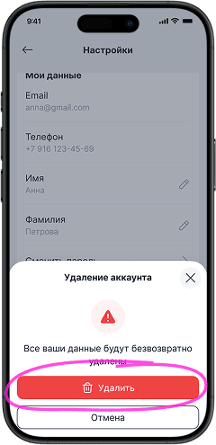 1. Перейдите в раздел «Настройки», кликнув на иконку 2. Выберите пункт «Удалить аккаунт» 3. Нажмите на кнопку «Удалить»